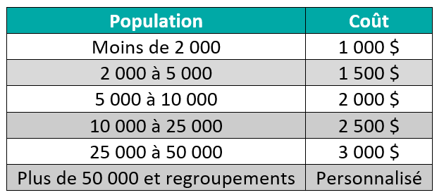 Les coûts de participation au programme sont établis selon la population. Les communautés autochtones n’ont aucuns frais à débourser.